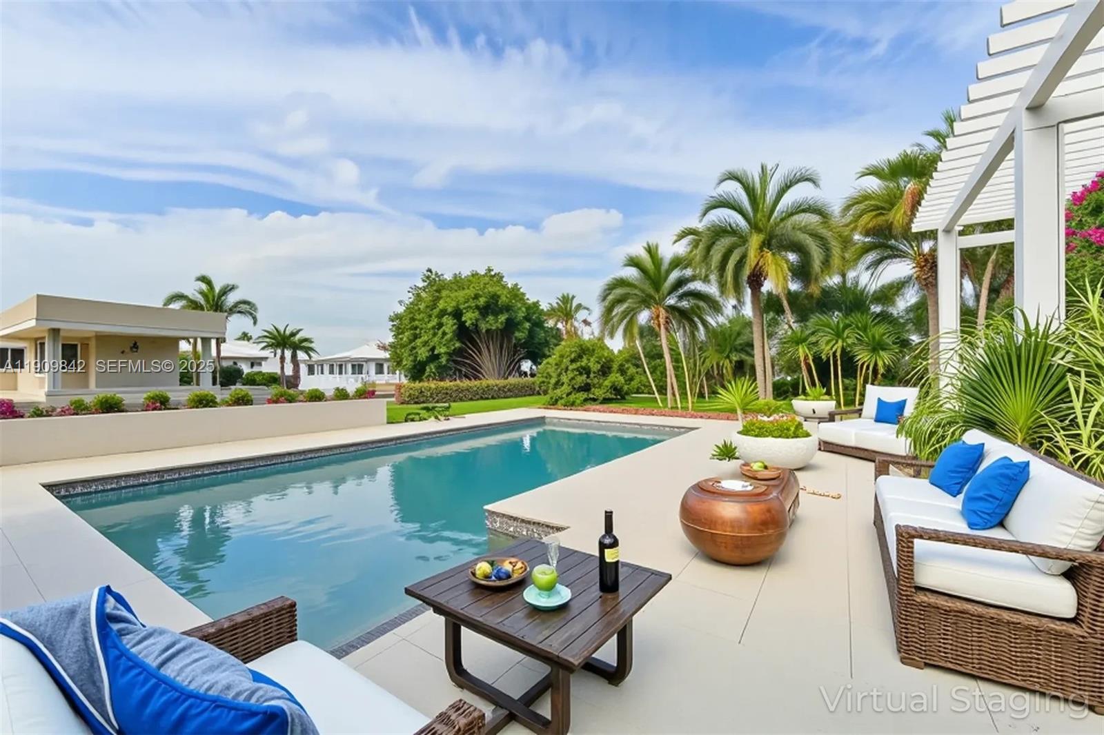 Discover elegant waterfront living in this Gables by the Sea residence on an 18,150 sq. ft. lot with no bridges to the bay. This 2-story 6-bedroom, 5-bath home features, primary suite on ground level, vaulted ceilings, skylights, and freshly painted interiors and exteriors that radiate warmth and sophistication. The open layout flows to a screened-in patio, ideal for entertaining or relaxing. A private 1-bedroom, 1-bath guest house with a kitchenette offers comfort for guests or in-laws. Enjoy ocean breezes, water views, a large dock with 30 amps connection with direct bay access, and close proximity to excellent schools.