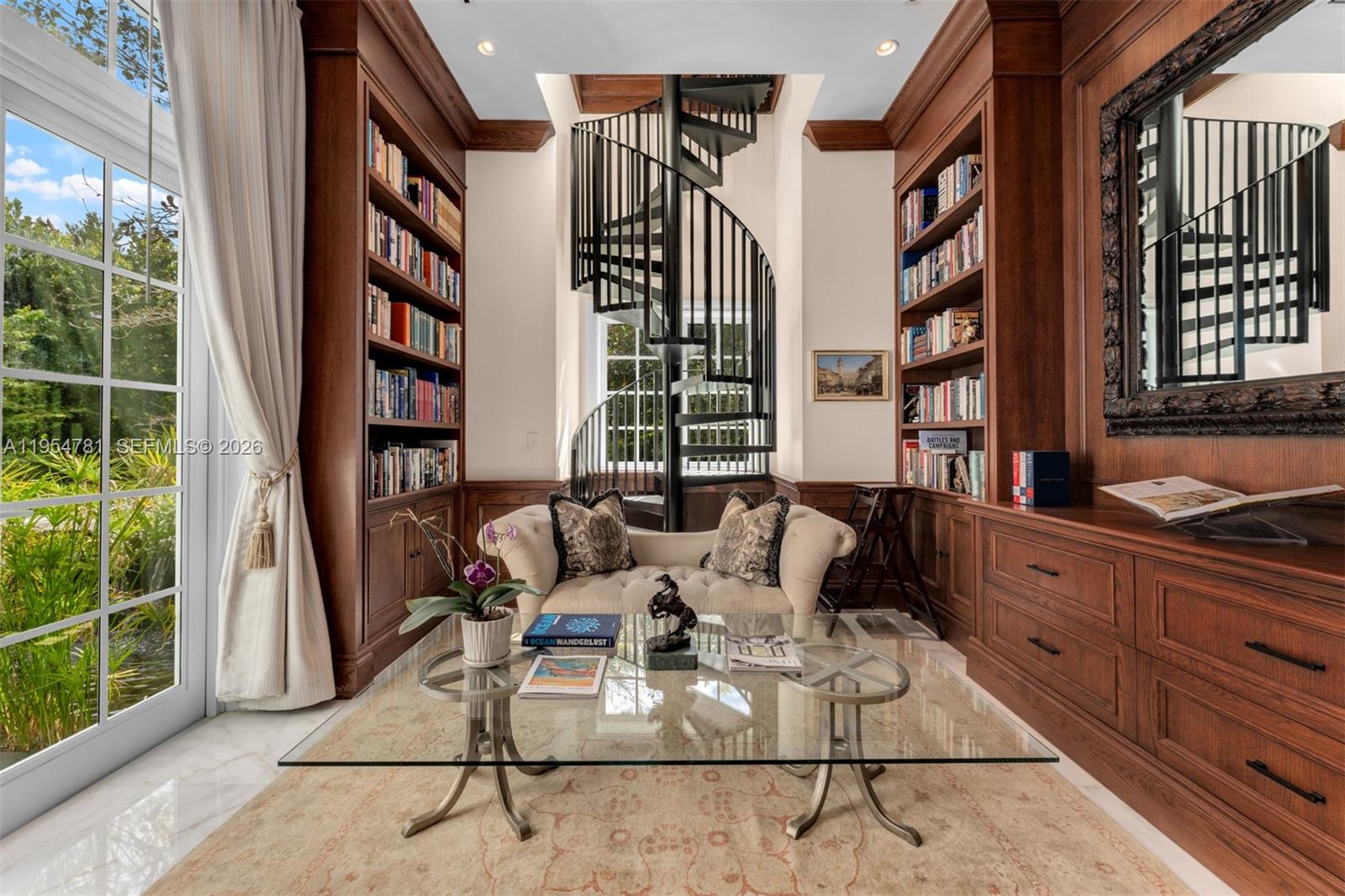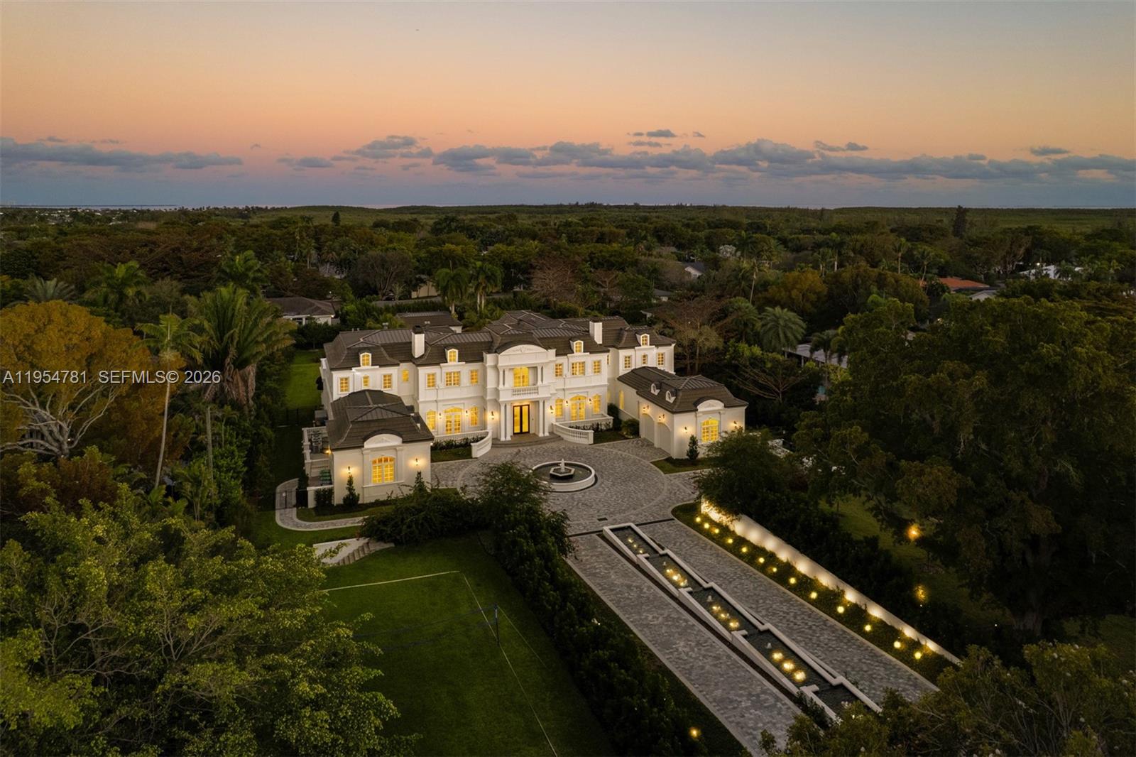 Set on nearly 2 acres and approached by a grand circular driveway with a dramatic 90+ ft cascading fountain, Chateau du Soleil showcases award-winning architecture by Ramon Pacheco. Inspired by classic French chateau design, the estate blends timeless elegance with modern luxury, featuring soaring ceilings, fireplaces, dormer windows, and exquisite wall detailing. A striking two-story library anchors the home, complemented by a private theater, gym, elevator, staff quarters, and three staircases. The primary suite offers expansive walk-in closets and a private terrace, while additional suites enjoy balcony views. Resort-style grounds feature lush lawns, koi pond, covered terraces, summer kitchen, gazebo with fire pit, cabana bath, and room for a future sports court near elite Pinecrest schools.